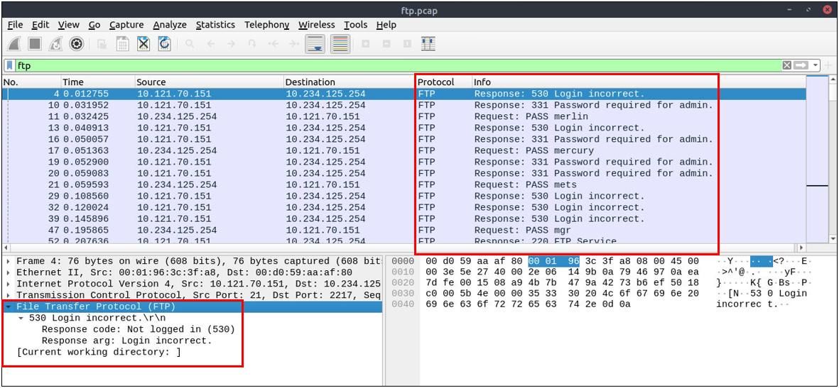 ftp.response.code == 530(ftp.response.code == 530) and (ftp.response.arg contains "username")(ftp.request.command == "PASS" ) and (ftp.request.arg == "password")